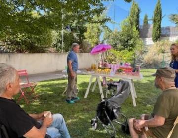 Vous l’aurez compris un seul objectif : la transmission des mémoires ! Exemple en image d'un atelier : reprise d'une recette d'une résidente atteinte de la maladie Alzheimer , élaboration dans la matinée par un groupe de 10 résidents de la recette citée de la soupe au Pistou et dégustation avec les artistes pour le repas du soir sur la terrasse